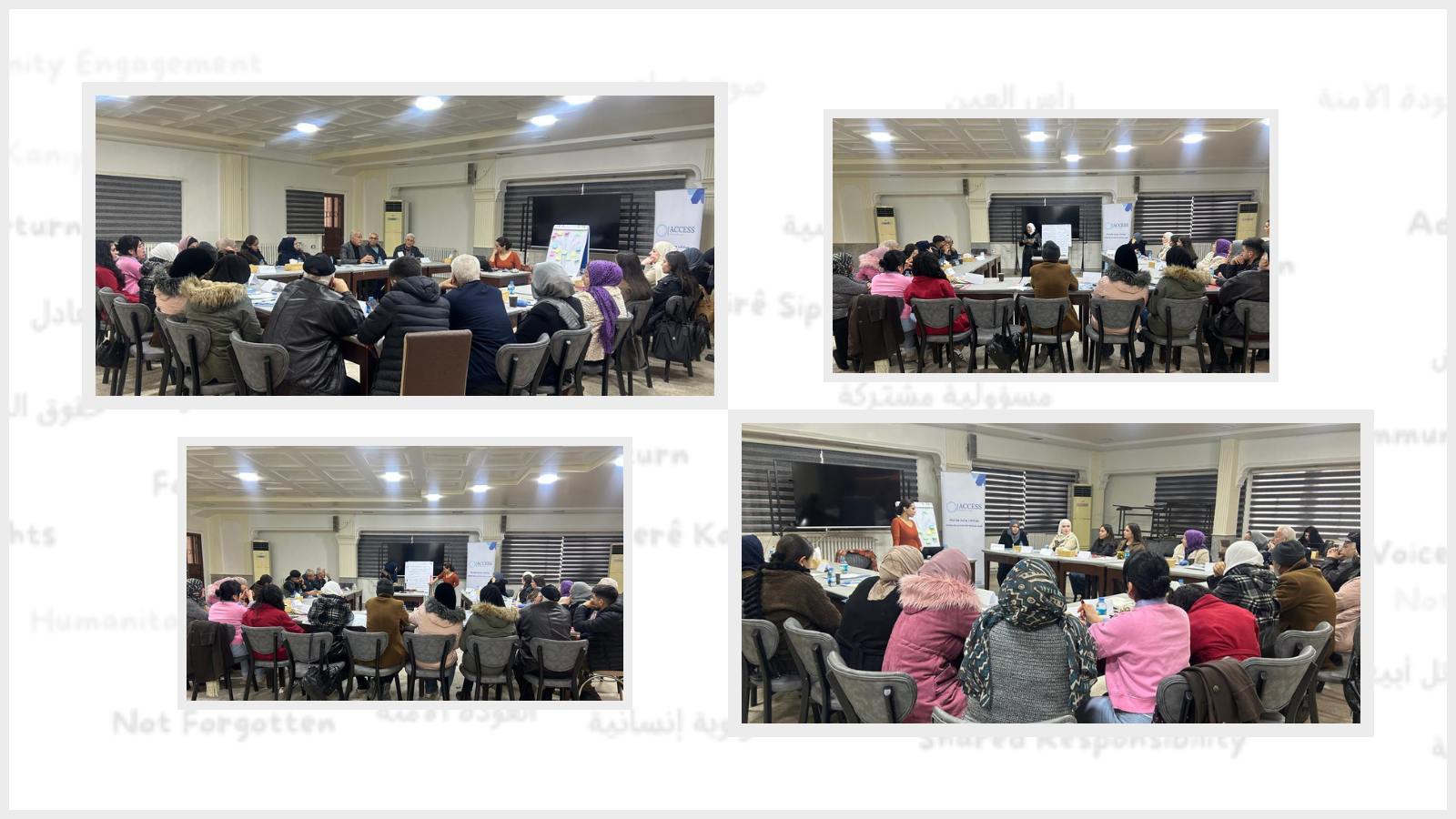 ارتكزت المنهجية على ثلاث مراحل مترابطة شكّلت مساراً تدريجياً متكاملاً. في المرحلة الأولى، جرى تنظيم جلسات تفاعلية مغلقة وفّرت مساحات آمنة للحوار، مكّنت المشاركين/ات من مشاركة تجارب التهجير القسري، وتحليل آثارها الاجتماعية والاقتصادية والنفسية، وتحديد القضايا ذات الأولوية من منظورهم/ن المباشر. اعتمدت هذه الجلسات أدوات الحوار المفتوح، والعمل ضمن مجموعات صغيرة، وتمارين تحليل تشاركية، بما أتاح الانتقال من التجربة الفردية إلى الفهم الجماعي، ومن الشكوى إلى صياغة مطالب واضحة.